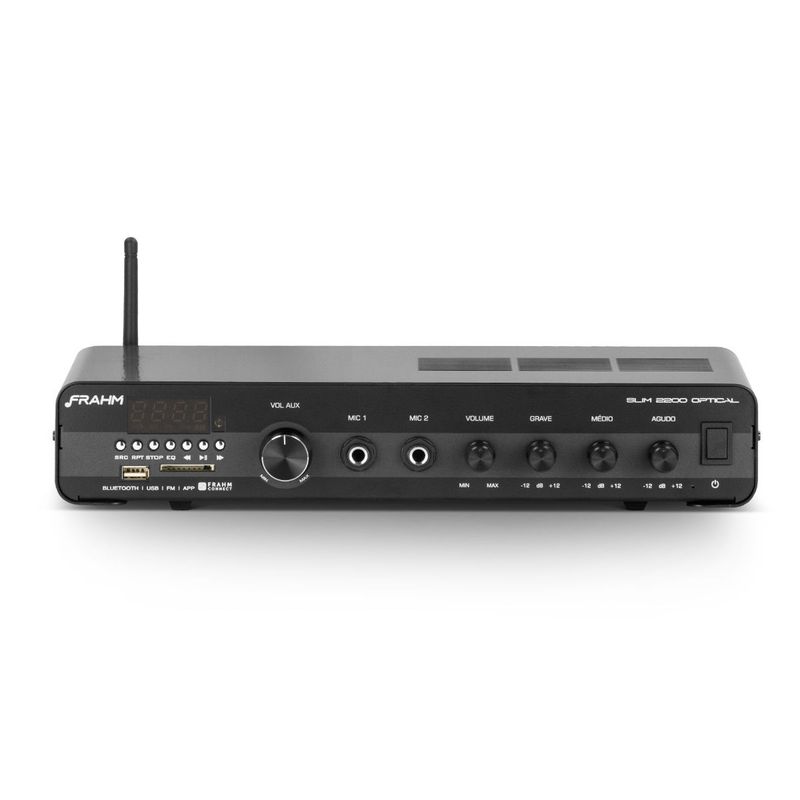 O amplificador Slim 2200 Optical possui 120 Watts RMS (2 Ohms) de potência e é ideal para pequenos/médios ambientes. Possibilita comando de funções via aplicativo Frahm, além de conexão OPTICAL (recomendado para uso em TVS ou receptores digitais), possui também USB, SD Card, auxiliar (RCA), entradas para 2 Microfones com função "Volume Inteligente" (Baixa a trilha sonora automaticamente quando usado), Rádio FM e Bluetooth.