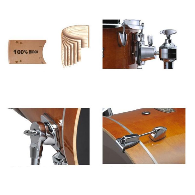 As especificações de revestimento do acabamento alcançam o tipo de beleza encontrado em kits de bateria de alta qualidade. A individualidade criada pelas variações no grão da madeira natural e o acabamento laqueado à mão tornarão sua bateria única.
