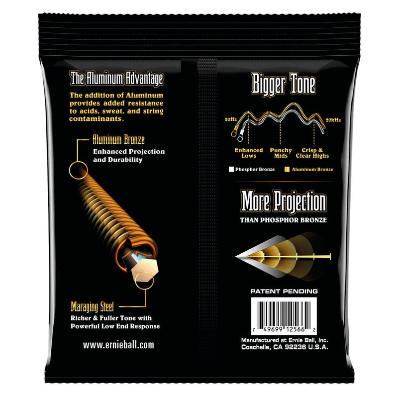 A corda Ernie Ball Aluminium Bronze tem tensão média, feita com fios hexagonais de aço Maraging Ernie Ball no núcleo, envoltos em um fio de alumínio bronze. Por isso, fornece baixos mais pronunciados, agudos brilhantes e maior nitidez no som.