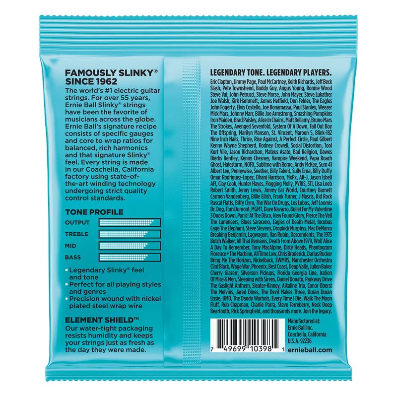 O jogo de cordas Mighty Slinkys ficam entre as populares cordas Super Slinky e Extra Slinky, proporcionando uma tensão rápida e leve em todas as seis cordas. Manômetros.