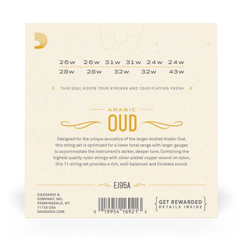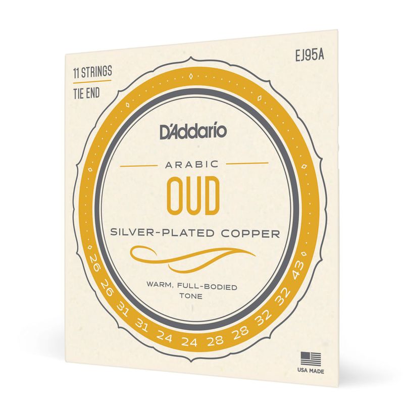 O D'Addario EJ95A é um encordoamento com núcleo de nylon otimizado para uso com Oud Árabe de 11 cordas, afinado CFADGC. A linha de produtos D'Addario projetada para instrumentos regionais (World Music) é baseada em pesquisas e testes com fabricantes desses instrumentos, educadores e musicos profissionais.