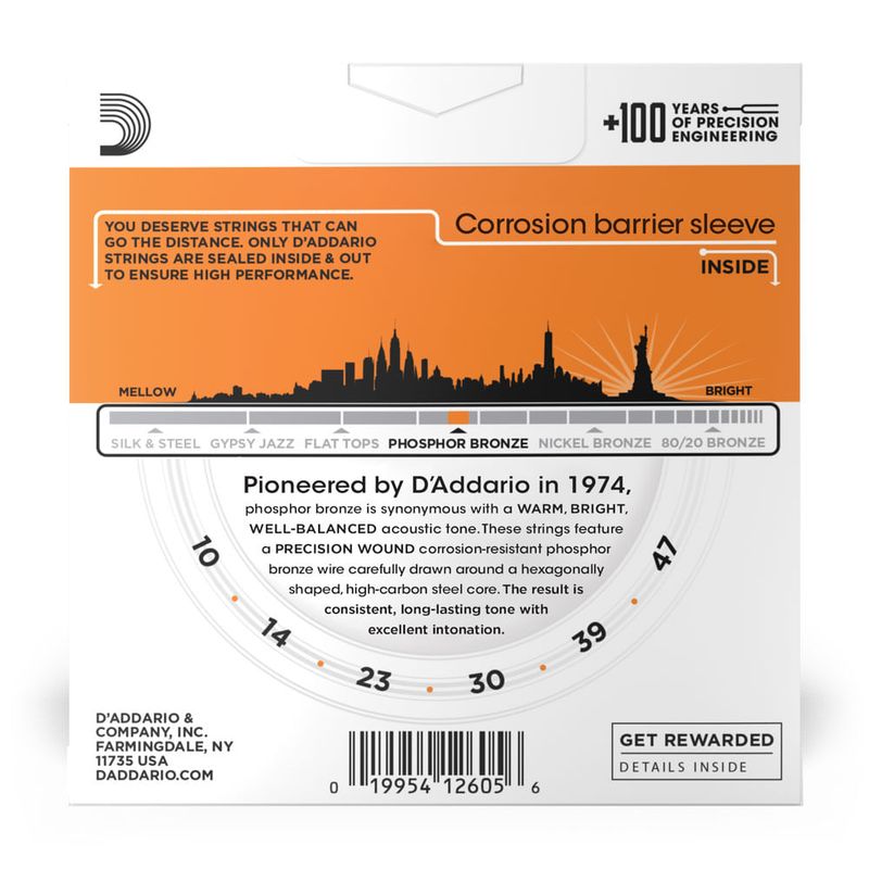 O Phosphor Bronze foi introduzido na fabricação de cordas pela D'Addario em 1974. A partir de então tornou-se a escolha preferencial de grandes músicos em todo o mundo, tanto para palco, como para estúdio. Seu núcleo de aço com alta concentração de carbono proporciona um timbre quente, brilhante e equilibrado. As cordas D'Addario Phosphor Bronze são uma referência para todas as cordas de violão.
