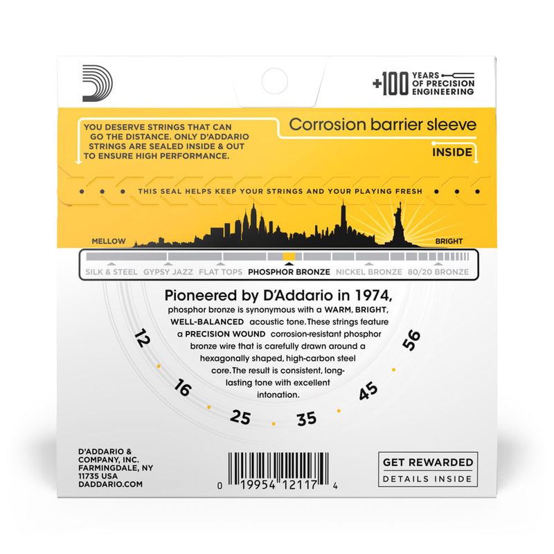 O Phosphor Bronze foi introduzido na fabricação de cordas pela D'Addario em 1974. A partir de então tornou-se a escolha preferencial de grandes músicos em todo o mundo, tanto para palco, como para estúdio. Seu núcleo de aço com alta concentração de carbono proporciona um timbre quente, brilhante e equilibrado. As cordas D'Addario Phosphor Bronze são uma referência para todas as cordas de violão. O modelo EJ19 possui cordas híbridas na tensão 12-56 (Light Top/Medium Bottom), recomendado especialmente para músicos de Bluegrass, com graves poderosos para as bases e agudos versáteis para os solos.