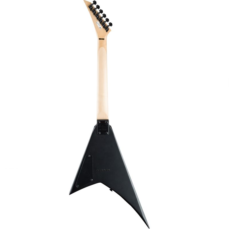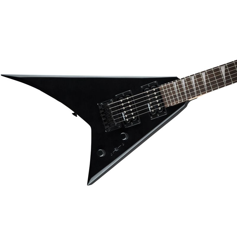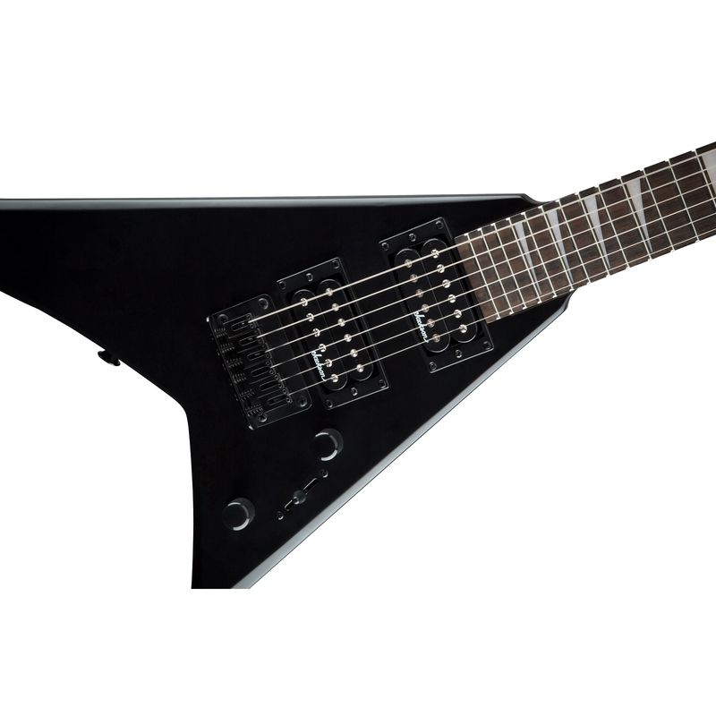 Outras características incluem dois captadores humbucking Jackson de alto ganho com chave seletora de três posições, controles de volume e tonalidade individuais, ponte fixa com cordas passantes pelo corpo, saddles em bloco e ferragens pretas.