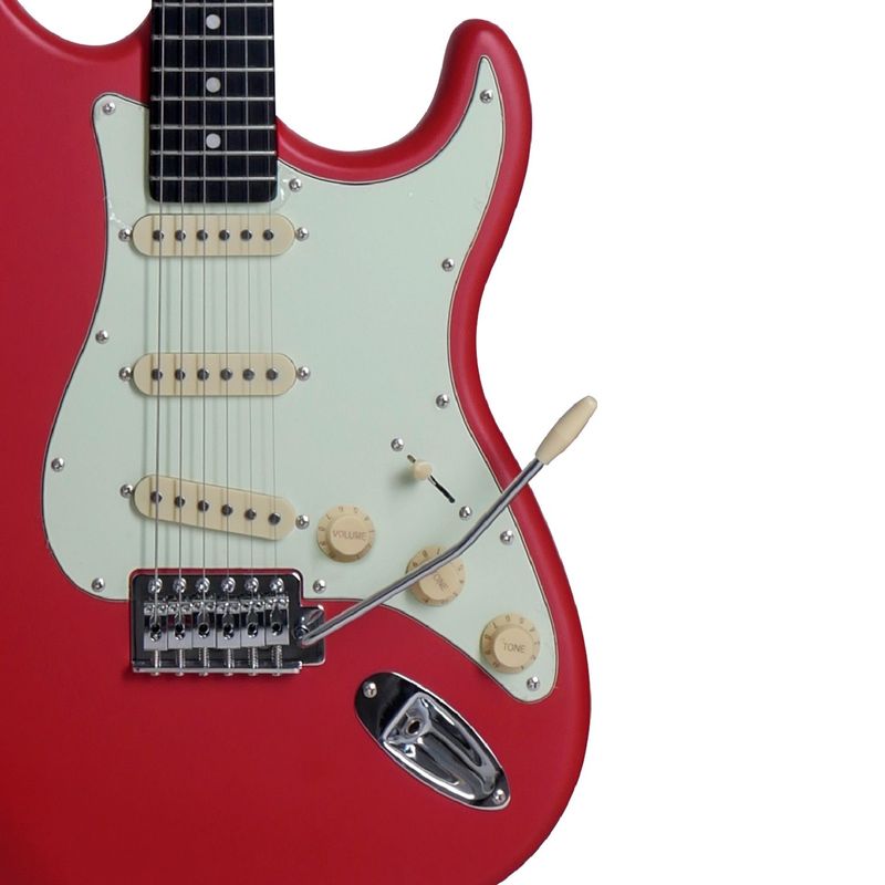 Com um corpo de basswood e um braço de maple no formato C, esta guitarra proporciona conforto e durabilidade para uma experiência de tocar suave e responsiva. A escala em Techwood, com 22 trastes, oferece precisão e facilidade de execução, enquanto a ponte tremolo permite uma ampla gama de efeitos e expressões.