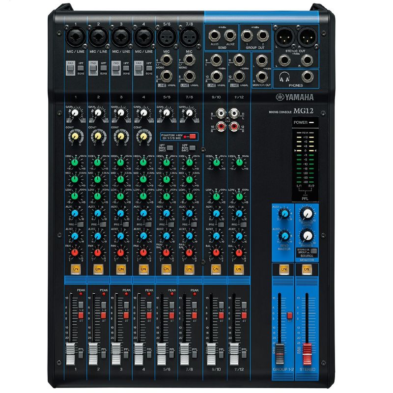 A MG12 da Yamaha é uma mesa de som compacta de 12 entradas simultâneas que é ideal para performances , gravações de palestras e muito mais. A mesa de Som Yamaha MG 12 possui quatro microfone mono / linha canais de entrada de combinação, dois canais de entrada de linha estéreo , que também pode ser usado como microfone mono ou entradas de linha ( XLR e estéreo 1/4 " inputs) , e duas entradas de linha estéreo com 1/4 " e conectores RCA .