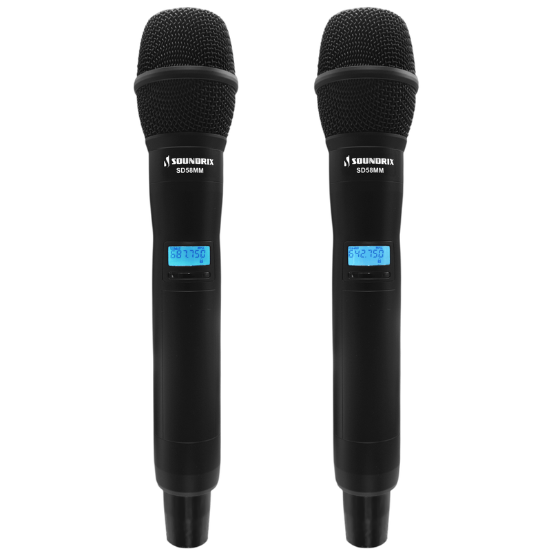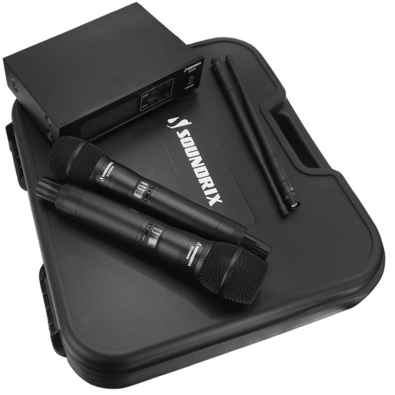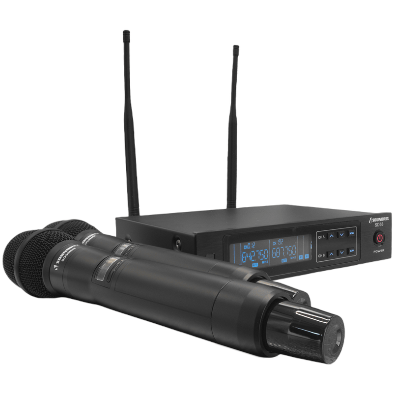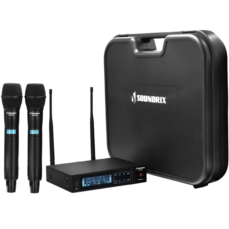 O sistema de microfone sem fio Vocal da Soundrix inclui um receptor e dois transmissores de mão com capsula SD58. O Microfone Sem Fio Soudrix SD58 MM está configurado para faixa de frequência da Soundrix entre 614 ~ 698 MHz