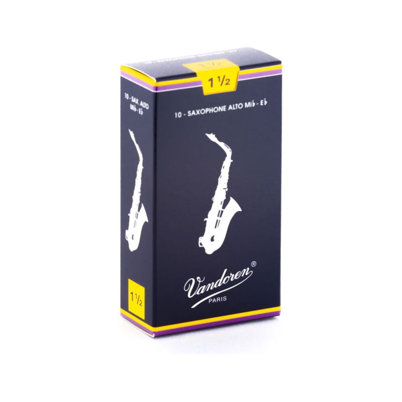 Palheta Tradicional para Sax Alto com 10 Vandoren As palhetas tradicionais para sax da Vandoren são famosas no mercado por sua extrema qualidade, sendo em sua construção e no material utilizado. O modelo para Sax Alto possui uma ótima resposta sonora e uma ótima flexibilidade permitindo execuções de grandes intervalos em legato ou staccato. - Quantidade: 10 unidades; -Material: Cana -Espessura da Ponta: 0,09 mm -Espessura do Talão: 2,8 mm