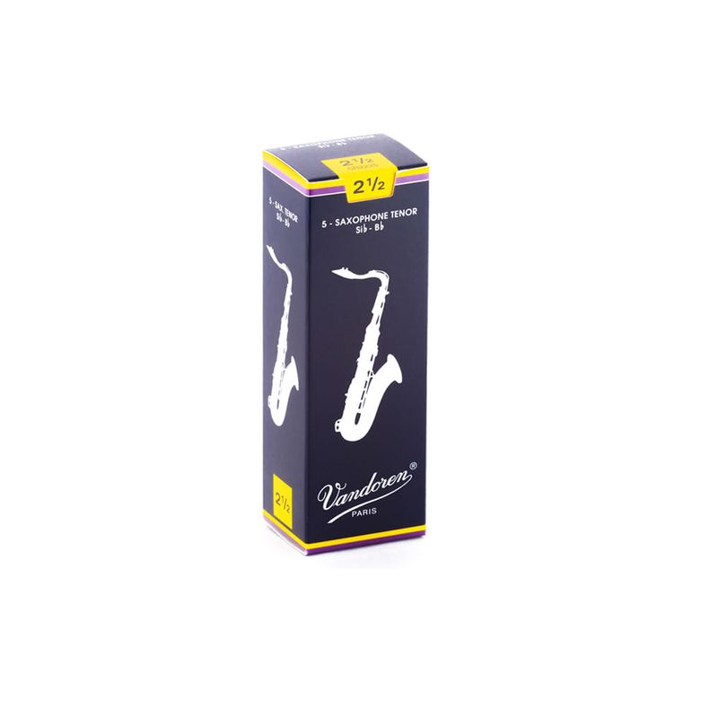 Palheta Tradicional para Sax Tenor com 5 Vandoren Com superioridade comprovada ao longo dos anos e a mais famosa do mercado, as palhetas tradicionais para sax da Vandoren são superiores em qualidade para uso profissional. Possuem grande flexibilidade em execuções de grande intervalo em legato ou staccato, e excelente resposta permitindo notas mais altas. - Quantidades: 5 unidades; Material: Cana Espessura da Ponta: 0,09 mm Espessura do Talão: 2,8 mm