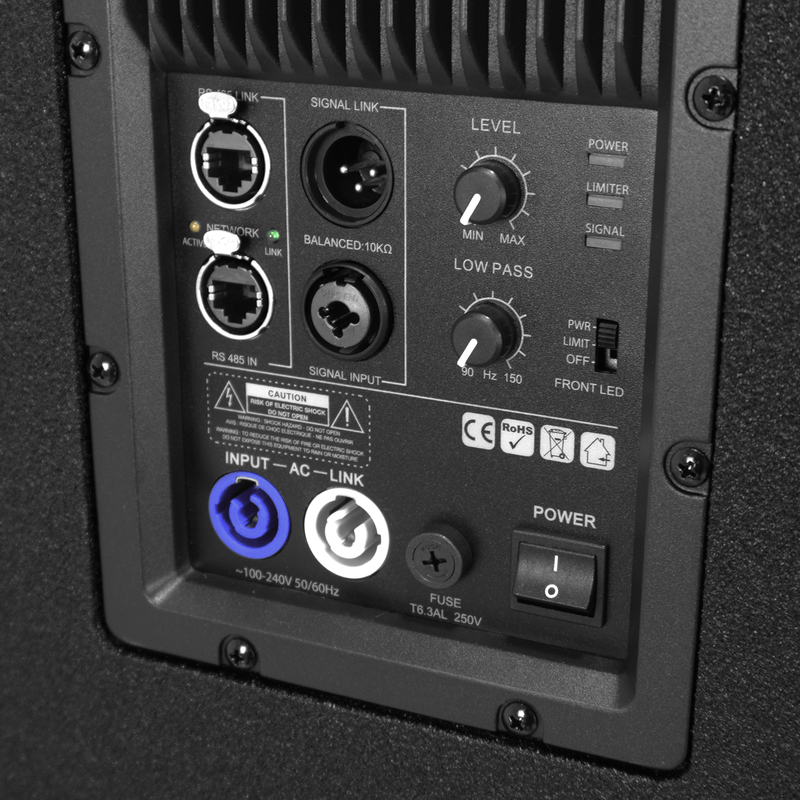 Gerenciamento via Rede (RS485): Permite controlar e monitorar múltiplos subwoofers simultaneamente através de um software via PC. Ajuste ganho, EQ, Delay e Limiter à distância.