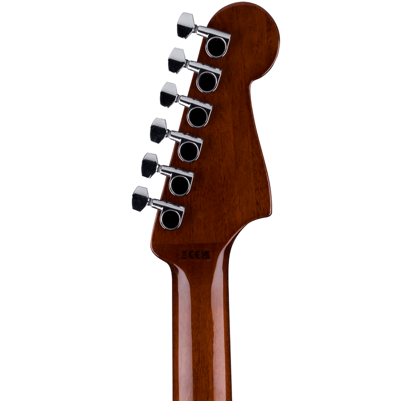 Um recurso de design da Fender instantaneamente reconhecível, o headstock com 6 tarraxas em linha cria uma tração de cordas reta a partir da pestana para o desempenho ideal das tarraxas, posiciona todas as tarraxas em um local linear para fácil acesso, e o design inclinado (tilt-back) produz um ângulo de quebra consistente em todas as cordas para uma resposta e sensação de toque uniformes.